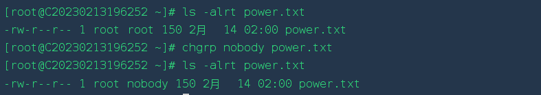 [root@localhost test]# ll ---xrw-r-- 1 root bin 302108 11-13 06:03 log2012.log -rw-r--r-- 1 root root 61 11-13 06:03 log2013.log [root@localhost test]# chgrp --reference=log2012.log log2013.log [root@localhost test]# ll ---xrw-r-- 1 root bin 302108 11-13 06:03 log2012.log -rw-r--r-- 1 root bin 61 11-13 06:03 log2013.log