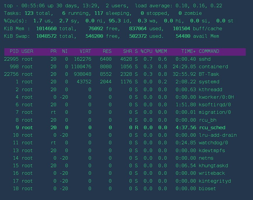 http://heipark.iteye.com/blog/1340384 需要注意的是,多核cpu需要用这个值除以逻辑核心的数量 第二行:Tasks: 259 total, 2 running, 257 sleeping, 0 stopped, 0 zombie